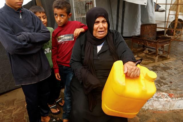 지난 15일 가자지구 남부 칸 유니스 난민 캠프 주민들이 빗물을 모으고 있는 가운데 한 여성이 물통을 들고 있다. 칸 유니스=로이터 연합뉴스