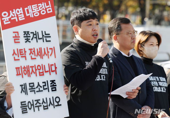 [서울=뉴시스] 김진아 기자 = 14일 서울 용산구 대통령실 앞에서 열린 강제퇴거 위기에 놓인 신탁 전세사기 피해자 대책 마련 및 면담 촉구 기자회견에서 대구 침산동 신탁주택 전세사기 피해자 정태운 씨가 발언하고 있다. 2023.11.14. bluesoda@newsis.com |