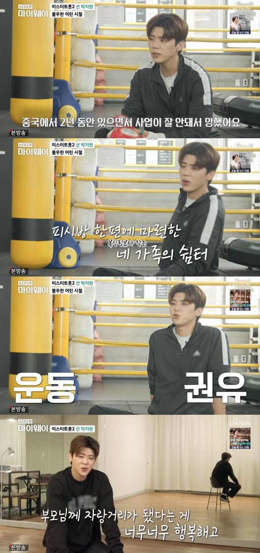 그때 박지현 아버지는 박지현이 방황할까 싶어 운동을 권했다며 복싱을 시작하게 된 계기를 밝혔다. 중학교 2학년 때 시작한 박지현은 10년차 경력을 갖게 됐다. 이후 박지현은 ‘미스터트롯2’에 도전해 준우승을 하며 인생역전 하게 됐다. 이에 대해 박지현은 “부모님께 자랑거리가 됐다는 게 너무 너무 행복하다. 팬분들도생기고 요즘 너무 행복하고 감사하다”라고 전했다.