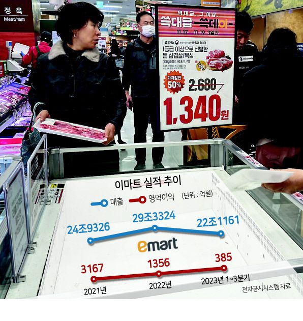 최근 이마트는 국내 최고 수준의 ‘바잉 파워’를 갖춘 만큼 이를 더욱 차별화해 시장 장악력을 키운다는 복안을 내놨다. 높은 물가상승률로 인한 소비 침체와 온라인 쇼핑 환경 변화 등으로 이마트의 지난해 영업이익(1356억원)은 1년 전(3167억원)의 절반 이하로 줄었다. 올해 3분기 영업이익은 1102억원으로 지난해 같은 기간보다 소폭(5%) 증가하는 데 그쳤다.