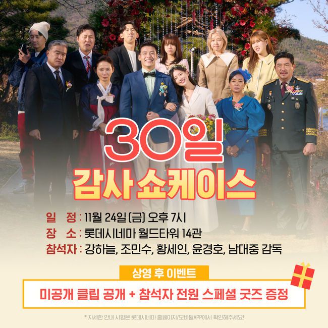 관객들의 뜨거운 사랑에 보답하고자 '30일'의 주역들이 진심을 담아 준비한 감사 쇼케이스는 오늘(20일) 오후 6시부터 롯데시네마 앱과 홈페이지를 통해 예매 가능하다.