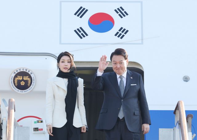▲영국을 국빈 방문하는 윤석열 대통령과 부인 김건희 여사가 20일 경기 성남 서울공항에서 전용기인 공군 1호기에 올라 출국 인사를 하고 있다. ⓒ연합뉴스 |