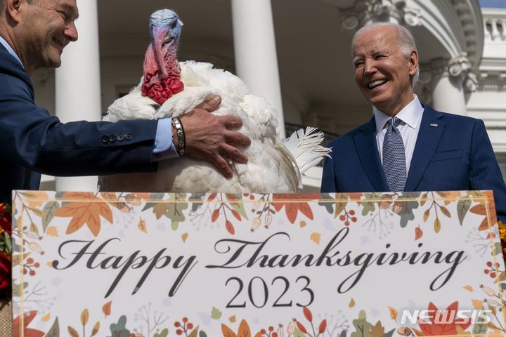 [워싱턴=AP/뉴시스] 조 바이든 미국대통령이 20일 백악관에서 열린 2023년 추수감사절 칠면조 사면 파티에서 미네소타 출신의 칠면조들에 대한 사면식을 거행하며 웃고 있다. 2023.11.21.