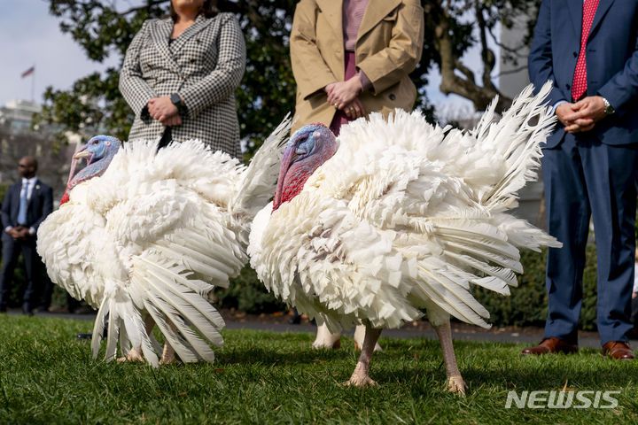 [워싱턴=AP/뉴시스] 20일(현지시각) 백악관 사우스론에서 제76회 추수감사절 칠면조 사면 행사가 열려 미네소타에서 온 칠면조 '리버티'(자유)와 '벨'(종)이 사면을 기다리고 있다. 이날 생일을 맞기도 한 바이든 대통령은 백악관 전통에 따라 칠면조 사면식을 열고 이들을 사면했다. 사면된 칠면조들은 여생을 죽임당하지 않고 살게 된다. 2023.11.21.