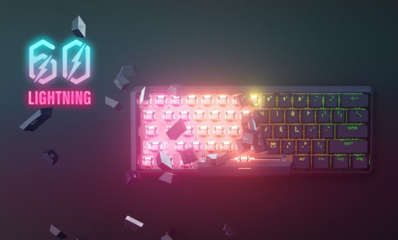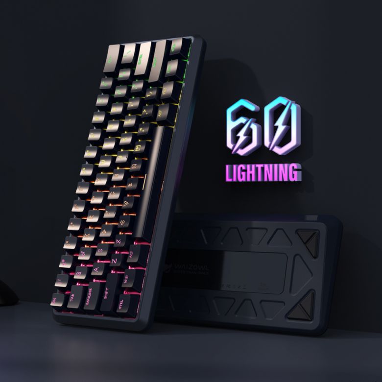 라이트닝 60은 샌드위치 방식으로 타건 시 통 울림 없는 안정감을 보여주며, 기존 우팅키보드를 개선한 61키 배열과 더욱 견고한 알루미늄 상판을 사용해 전체적인 무게감과 깔끔한 디자인으로 완성도를 높혔다.