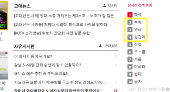지난 20일 고려대학교 학생 커뮤니티 '고파스'에 성관계 영상이 올라와 논란인 가운데 하루가 지난 21일 해당 커뮤니티 실시간 검색어엔 관련 단어가 올라와 있다. 〈사진=고파스 홈페이지 캡처〉 |