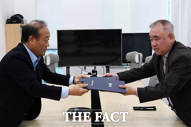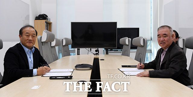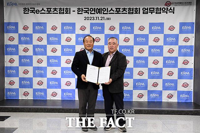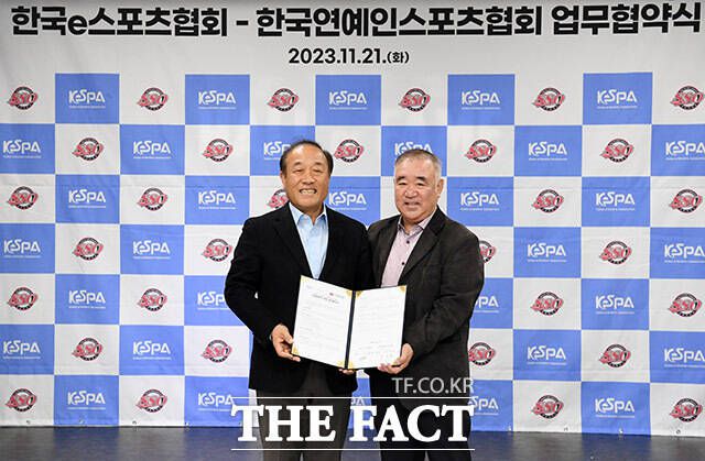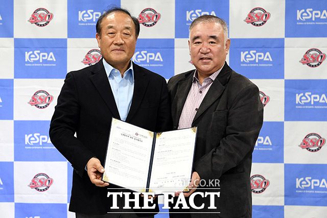[더팩트ㅣ남용희 기자] 김영만 한국e스포츠협회 회장(왼쪽)과 박정철 한국연예인스포츠협회 회장이 21일 오후 서울 마포구 한국e스포츠협회에서 진행된 '한국e스포츠협회-한국연예인스포츠협회 업무협약 체결식'에서 기념촬영을 하고 있다.