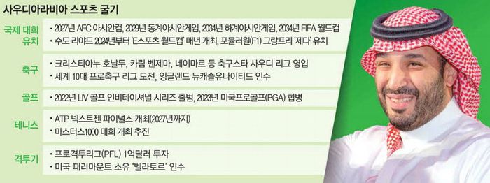 석유공룡 아람코의 후원을 받는 포뮬라원(F1)도 지난해부터 그랑그리 레이스 개최지에 사우디 ‘제다’를 포함시켰다. 사우디 국부펀드가 후원하는 ‘LIV 골프 인비테이셔널 시리즈’는 지난해 출범하며 막대한 자금력으로 스타 골퍼를 영입했으며, 올해에는 업계 1위인 미국프로골프(PGA)를 합병하는 파란을 일으켰다.