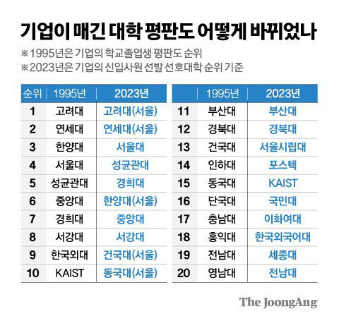 여대의 순위 상승도 눈에 띈다. 이화여대는 1997년 종합 12위였지만, 지난해 평가에선 6위에 올랐다. 특히 기업 인사 담당자를 대상으로 한 평판 조사에서 이화여대는 1996년 26위에 머물렀으나, 올해 평판 조사에선 17위로 약 10계단 상승했다. 숙명여대도 종합 순위가 2002년 37위에서 2019년 19위까지 크게 상승했다. 정기은 숙명여대 대외협력처장은 “여대도 시대의 흐름에 발맞춰 이공계 등 다양한 분야의 인재 육성과 산학협력을 확대한 결과”라고 말했다.