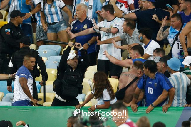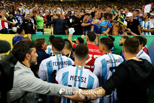 소요 사태를 본 아르헨티나 선수들은 관중석으로 가 제지를 요구했고 피를 흘리는 관중을 구급대원들이 옮겼다. 그럼에도 사태가 진정되지 않고 브라질 경찰들의 폭력 진압이 계속되자 에밀리아노 마르티네스 등을 비롯한 아르헨티나 선수들이 달려가 말렸고 메시는 경기를 거부했다. 아르헨티나 선수들이 라커룸으로 향하면서 경기는 일시 중단됐다. 이후 10시에 킥오프가 됐다. 기존 경기 시작 시간인 9시 30분보다 30분 늦게 시작한 것이다.