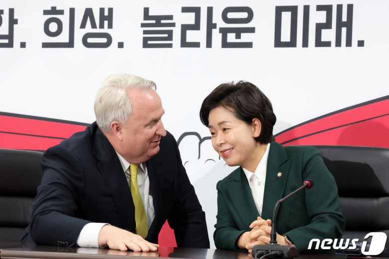 인요한 국민의힘 혁신위원장과 양향자 한국의희망 대표가 21일 오후 서울 여의도 국민의힘 중앙당사에서 열린 혁신위원회 10차 회의에서 대화를 나누고 있다. 이날 양 대표는 혁신위원들에게 '과학기술 인재 육성과 정치'를 주제로 강연을 한다. 2023.11.23/뉴스1 ⓒ News1 황기선 기자 |