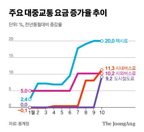 지하철 요금인 도시철도료가 9.2% 상승하면서 철도 여객수송 물가가 6.3% 올랐다. 시내버스료(11.3%)·시외버스료(10.2%)·택시료(20%)가 포함된 도로 여객수송 물가도 전년 동월 대비 13.8% 뛰었다. 지난 2월 서울 택시요금(3800→4800원) 인상을 시작으로 8월 서울 시내버스(1200→1500원)·광역버스(2300→3000원) 요금, 10월 수도권 지하철(1250→1400원) 요금까지 전국적인 교통료 인상이 겹친 영향이다.