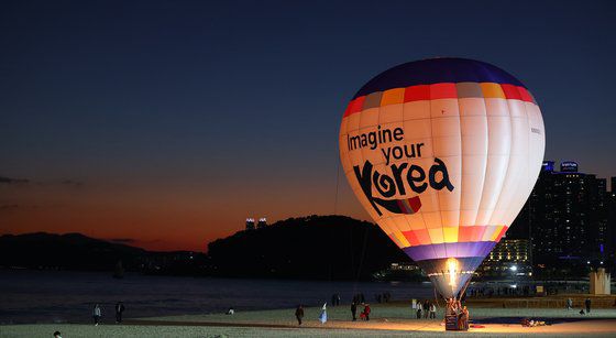 지난 25일 오후 부산 해운대구 해운대해수욕장에 2030부산엑스포 유치를 기원하는 대형 열기구가 떠오르고 있다. 연합뉴스 |