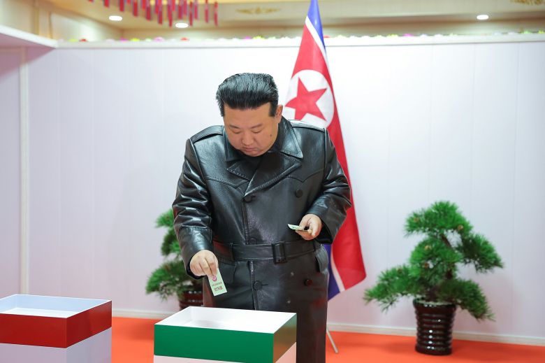 김정은 북한 국무위원장이 26일 도·시·군 인민회의 대의원 선거일을 맞아 함경남도 제55호 선거구 제26호 분구 선거장에서 선거에 참가했다고 27일 노동당 기관지 노동신문이 보도했다. 평양 노동신문=뉴스1