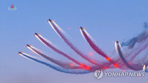 (서울=연합뉴스) 북한이 전승절 69주년(7.27)인 지난 27일 저녁 평양 조국해방전쟁승리기념탑 앞에서 기념행사를 진행됐다고 조선중앙TV가 28일 보도했다. 행사에서 북한 전투비행대들이 기교(곡예)비행을 펼쳐보이고 있다.[조선중앙TV 화면] 2022.7.28 [국내에서만 사용가능. 재배포 금지. For Use Only in the Republic of Korea. No Redistribution] nkphoto@yna.co.kr