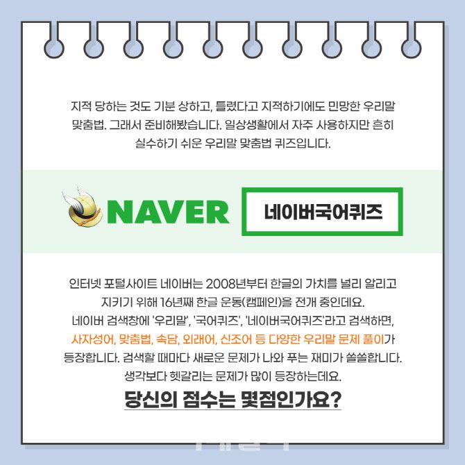 지적 당하는 것도 기분 상하고, 틀렸다고 지적하기에도 민망한 우리말 맞춤법. 그래서 준비해봤습니다. 일상생활에서 자주 사용하지만 흔히 실수하기 쉬운 우리말 맞춤법 퀴즈입니다. 인터넷 포털사이트 네이버는 2008년부터 한글의 가치를 널리 알리고 지키기 위해 16년째 한글 운동(캠페인)을 전개 중인데요. 네이버 검색창에 ’우리말‘, ’국어퀴즈‘, ’네이버국어퀴즈‘라고 검색하면, 사자성어, 맞춤법, 속담, 외래어, 신조어 등 다양한 우리말 문제 풀이가 등장합니다. 검색할 때마다 새로운 문제가 나와 푸는 재미가 쏠쏠합니다. 생각보다 헷갈리는 문제가 많이 등장하는데요. 당신의 점수는 몇점인가요?