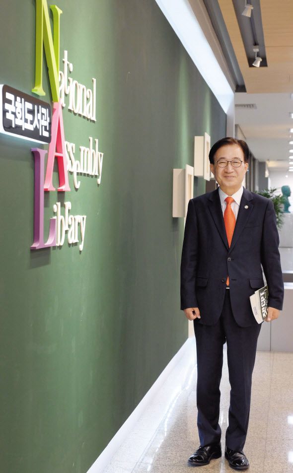 이명우 국회도서관장이 21일 서울 여의도 국회도서관에서 헤럴드경제 인터뷰에 앞서 사진 촬영을 하고 있다. 이상섭 기자 |