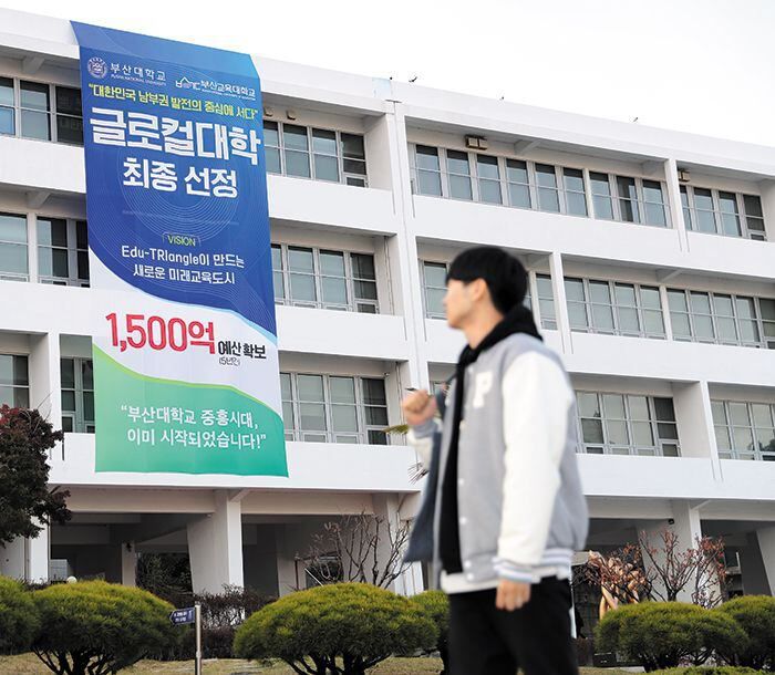 지난달 30일 부산시 금정구 장전동 부산대 인문관에 “부산대 중흥 시대 이미 시작됐습니다”란 문구가 적힌 현수막이 내걸려 있었다. 대학본부 앞에도 동문회·교직원 등이 비슷한 내용의 현수막을 걸었다. 차정인 부산대 총장은 “1946년 해방 이후 궁핍하던 시절 부산·경남 시민의 기부금으로 세워진 우리 대학이 부산교대와 함께 교육부의 ‘글로벌 대학′에 선정돼 ‘부산대 중흥 시대’를 열게 됐다”고 했다.