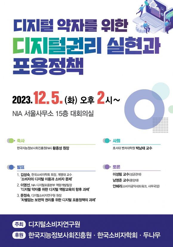디지털소비자연구원은 ‘디지털 약자를 위한 디지털권리 실현과 포용정책’이라는 주제로 오는 5일 정기세미나를 개최한다.