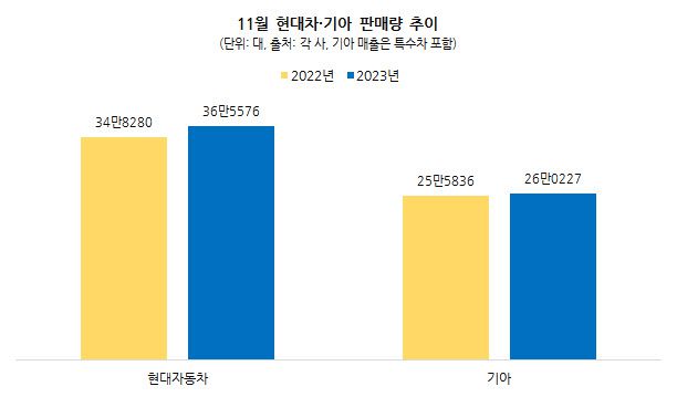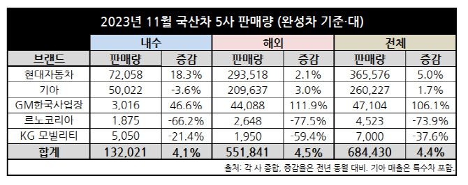 1일 국내 5개 완성차업체가 발표한 판매실적을 종합하면 우리나라 완성차 업체들의 올 11월 판매량은 68만4430대로 집계됐다. 이는 전년 동기 대비 4.4% 늘어난 수준으로 내수와 해외 모두 고른 성장을 보였다. 구체적으로 내수 시장 판매는 지난해 대비 4.1% 증가한 13만2021대로 나타났으며 해외서는 55만1841대를 판매해 4.5% 판매량이 증가했다.