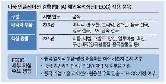 FEOC가 생산한 배터리 부품을 사용할 경우 2024년부터, 핵심 광물을 사용할 경우 2025년부터 보조금을 받을 수 없게 된다. IRA에 따르면 배터리 부품에 배터리 셀과 모듈, 분리막, 전해질이 포함된다. 핵심광물에는 리튬, 니켈, 코발트, 망간, 알루미늄, 흑연이 해당한다. IRA 세부지침은 양극활물질과 음극활물질 등의 ‘구성재료’도 핵심광물로 정의하고 있다.