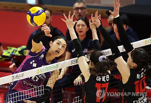 이어진 랠리에서 김연경은 페퍼저축은행 주포 야스민의 오픈 공격을 블로킹했다.