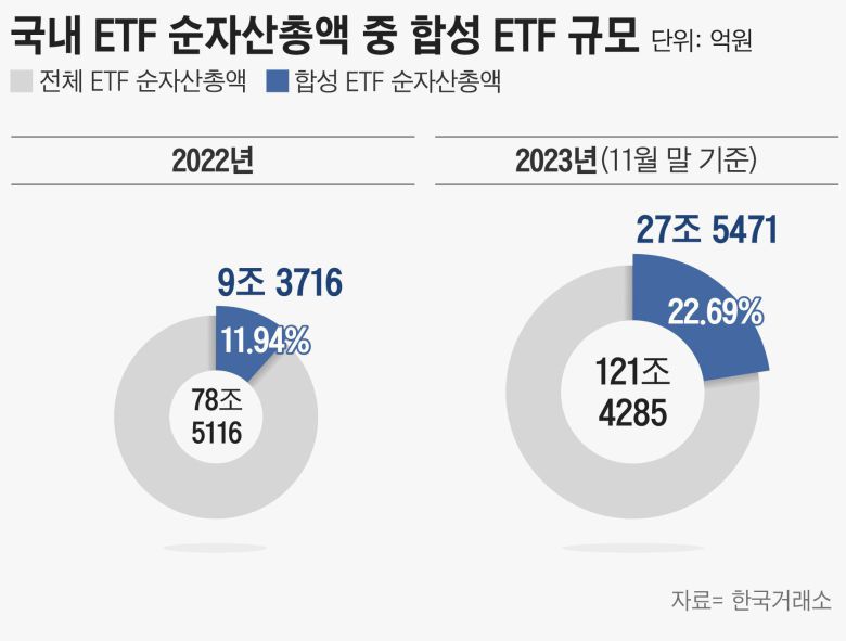 2일 한국거래소에 따르면 지난달 30일 기준 전체 ETF 순자산총액 121조4285억원 중 합성 ETF는 27조5471억원으로 집계됐다. 지난해 말(9조3716억원)과 비교하면 1년 만에 몸집이 3배가량 커진 셈이다. 현재 국내 증시에 상장된 전체 ETF 종목 803개 중 합성 ETF는 89개(11.08%)에 불과하지만, 순자산총액으로 보면 ETF 시장에서 차지하는 비중이 22.69%에 달한다. 지난해보다 2배 늘어난 수준이다.