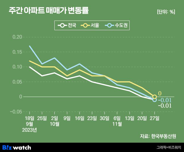 한국부동산원에 따르면 지난 11월 마지막주(27일 기준) 전국 아파트 매매가격 변동률은 -0.01%를 기록하며 하락 전환했습니다. 전국 아파트값이 떨어진 건 지난 6월 셋째 주 이후 23주 만입니다.