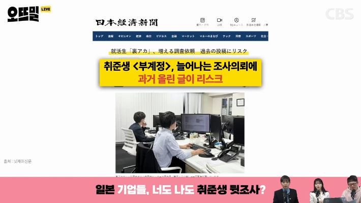 ◆ 박수정> 일본을 보면 한국의 미래를 알 수 있다는 말이 있잖아요. 일본에서 최근 몇 년 사이에 급부상한 비즈니스 사업 모델이 있다고 해서 우리나라에도 이런 게 도입될까라는 생각으로 한번 가져와 봤습니다. 닛케이 신문의 11월 27일 자 보도인데요. 이른바 취준생 뒷조사 서비스가 성행하고 있다는 내용의 기사입니다.