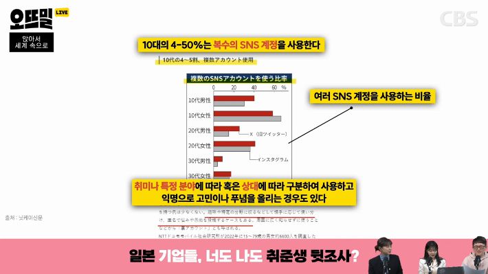 ◆ 박수정> **님께서도 "우리나라 회사에서도 SNS 계정 검색 돌려보는 거 다 하지 않나요?"라고 하셨는데 일본은 좀 다릅니다. 지금 일본 사회에서 이 서비스가 논란이 되고 있는 이유가 있는데요. 지원자의 공개된 SNS 계정만 보는 게 아니라 익명으로 사용하는 부계정까지 싹 다 조사한다는 거예요.