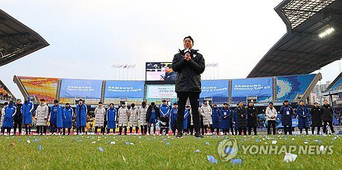 (수원=연합뉴스) 김도훈 기자 = 2일 경기도 수원월드컵경기장에서 열린 프로축구 하나원큐 K리그1 2023 마지막 38라운드 수원 삼성과 강원FC 경기에서 0-0으로 비기며 2부리그로 강등된 수원 삼성 염기훈 감독 대행이 팬들에게 사과의 말을 전하고 있다. 2023.12.2
