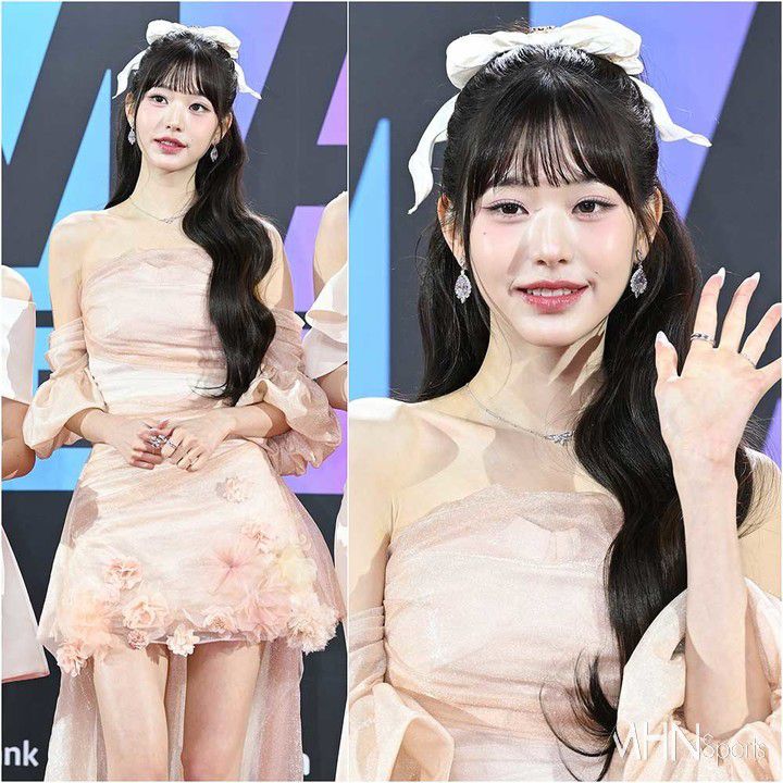 이날 장원영은 꽃 장식이 포인트 된 누드톤 오프숄더 드레스를 입고 등장했다. 포토월에 선 그는 환한 미소로 다양한 포즈를 선보이며 미모를 뽐냈다.