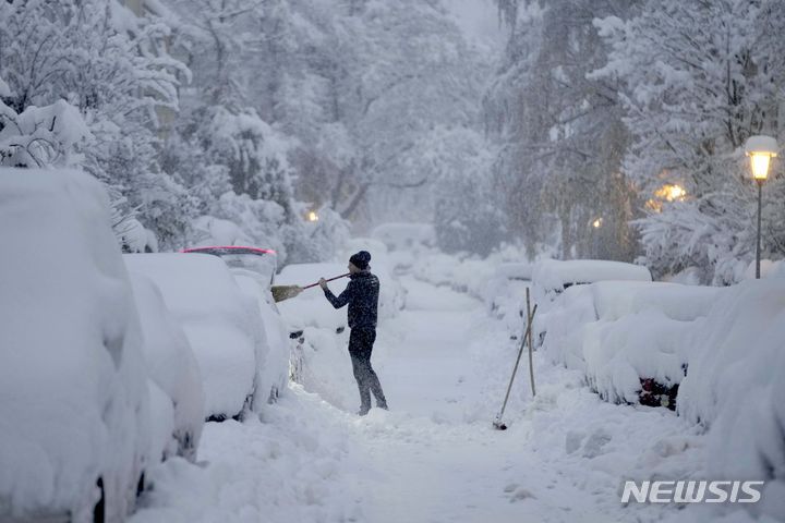 [뮌헨=AP/뉴시스] 많은 눈이 내린 2일(현지시간) 독일 뮌헨에서 한 시민이 차량에 쌓인 눈을 치우고 있다. 2023.12.04. |