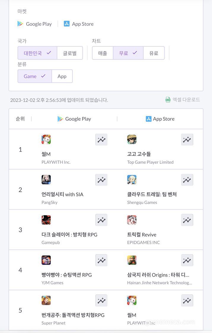 ▲ 12월 2일 구글 플레이·애플 앱스토어 인기 5위 (자료제공: 플레이위드코리아)