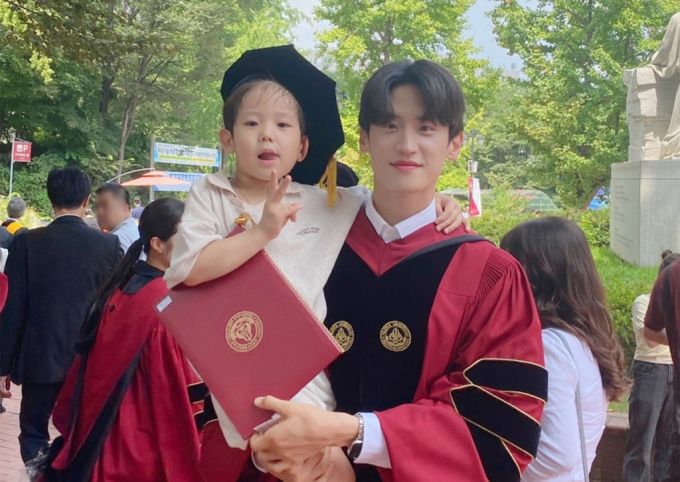 '제81회 후기 학위수여식'에서 박사학위를 받은 이대훈 전 태권도 국가대표가 아들 예찬군과 기념촬영하고 있다./사진제공=세종대