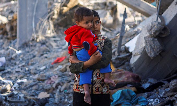 폭격당한 건물 잔해 속 가자지구 어린이 팔레스타인 소년이 4일(현지시간) 가자지구 남부 라파에서 동생으로 보이는 어린아이를 안고 폭격으로 무너진 건물 잔해를 둘러보고 있다. 지난 한 달여간 팔레스타인 무장정파 하마스 근거지인 가자 북부 지역을 초토화한 이스라엘군은 인질 석방을 위한 일시 휴전이 깨진 지난 1일부터 피란민이 몰린 남부 지역을 집중 공격하고 있다. 라파=로이터연합뉴스 |
