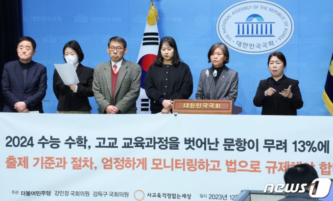 더불어민주당 강민정, 강득구 의원과 사교육걱정없는세상 회원들이 6일 서울 여의도 국회 소통관에서 열린 '2024학년도 대학수학능력시험 수학영역 문항 분석 결과 발표' 기자회견에서 "2024학년도 수능 수학영역 문항 중 일부가 고교 교육과정의 범위와 수준을 벗어난 '킬러문항'으로 출제됐다"고 밝히고 있다/사진=뉴스1 |