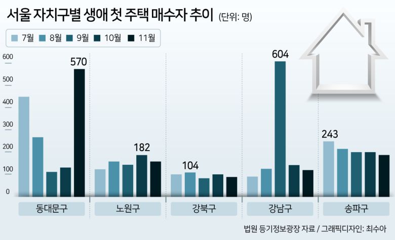 올해 1~11월 누계 수치를 보면 동대문구는 2407명이 첫 주택을 매수해 영끌(영혼까지 끌어모아 대출) 매수세가 강한 송파구(2541명) 다음으로 생애 첫 주택 구입 사례가 많았다. 2030세대 매수세가 쏠리는 지역인 노원구(1282명)·도봉구(928명)·강북구(935명) 등 ‘노도강’ 지역보다 적게는 1100여 명, 많게는 1400여 명 차이났다. 이밖에 강남구 1515명, 강동구 1480명, 서초구 1284명 등으로 1000명대를 기록한 자치구가 대다수였다.
