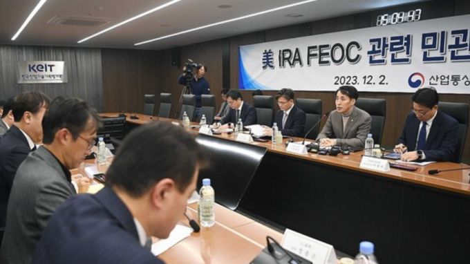 미국 정부가 지난 1일 인플레이션감축법(IRA) ‘해외우려집단’ 세부 규정 초안을 발표했다. 사진은 지난 2일 오후 서울 중구 대한상공회의소에서 열린 ‘미국 인플레이션 감축법 해외우려기관 관련 민관합동 대응회의’. 연합뉴스 |
