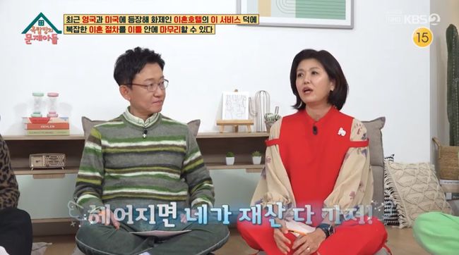 이날 퀴즈로 영국과 미국에서 등장해 화제인 이혼 호텔의 서비스에 대한 문제가 나왔다. 진양혜는 "남편은 만약 우리가 헤어지게 되면 네가 다 가져가라고 했다"라고 말했다. 이에 손범수는 "내가 미쳤었나보다. 그땐 어려서 잘 몰랐을 때다. 지금은 반띵으로 가자"라고 말해 주위를 폭소케 했다.