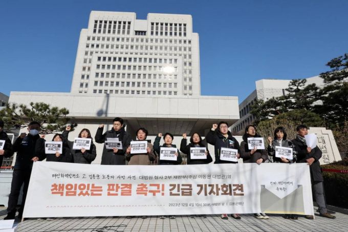 [서울=뉴시스] 조성우 기자 = 4일 오전 서울 서초구 대법원 정문 앞에서 열린 '김용균 사망' 원청 한국서부발전 대법원 엄정 처벌 촉구 기자회견에서 고 김용균 씨 어머니인 김미숙 김용균재단 대표(오른쪽 다섯 번째부터), 현정희 공공운수노조 위원장 등 참석자들이 구호를 외치고 있다. 2023.12.04. |