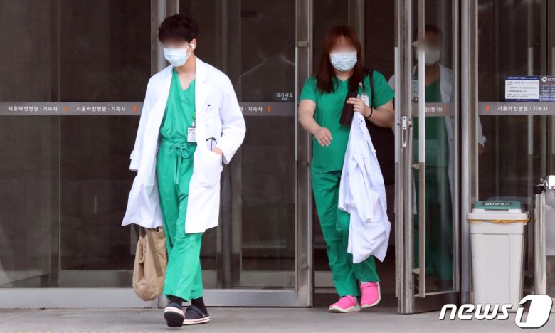 서울의 한 종합병원에서 일하는 전공의들이 기숙사에서 나오고 있다. /뉴스1 ⓒ News1 김명섭 기자