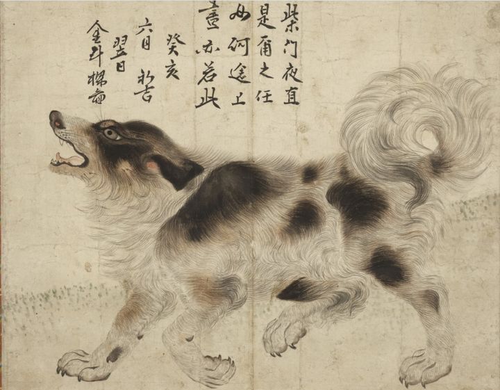 21세기 한문이 영어처럼 어려운 세상이 되어 뜻은 모르지만, 개의 표정이 심상치 않은 일이 있음을 알려준다. 위로 치켜든 매서운 눈매, 송곳니를 드러낸 채 짖고 있는 그림은 280년이 지났지만 컹컹 소리가 들릴 듯 여전히 사납게 살아있다. 한 올 한 올 복슬거리는 털이 곤두서 날리고 꼬리털까지 바짝 긴장한 동세가 생생하고 사실적이다.