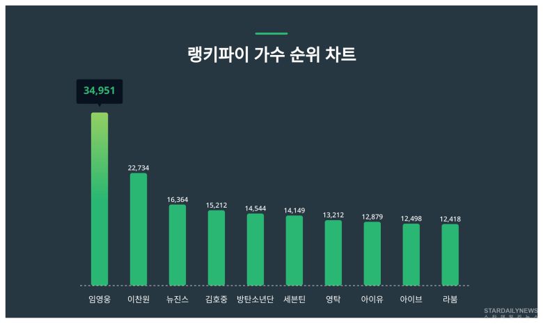 1위 임영웅은 트랜드지수 34,951점으로 전일 33,589점보다 1,362점 상승했다.