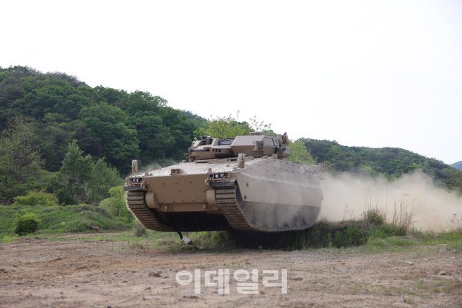 레드백 장갑차가 기동 시연에서 둔턱을 뛰어넘고 있다. (사진=한화에어로스페이스) |