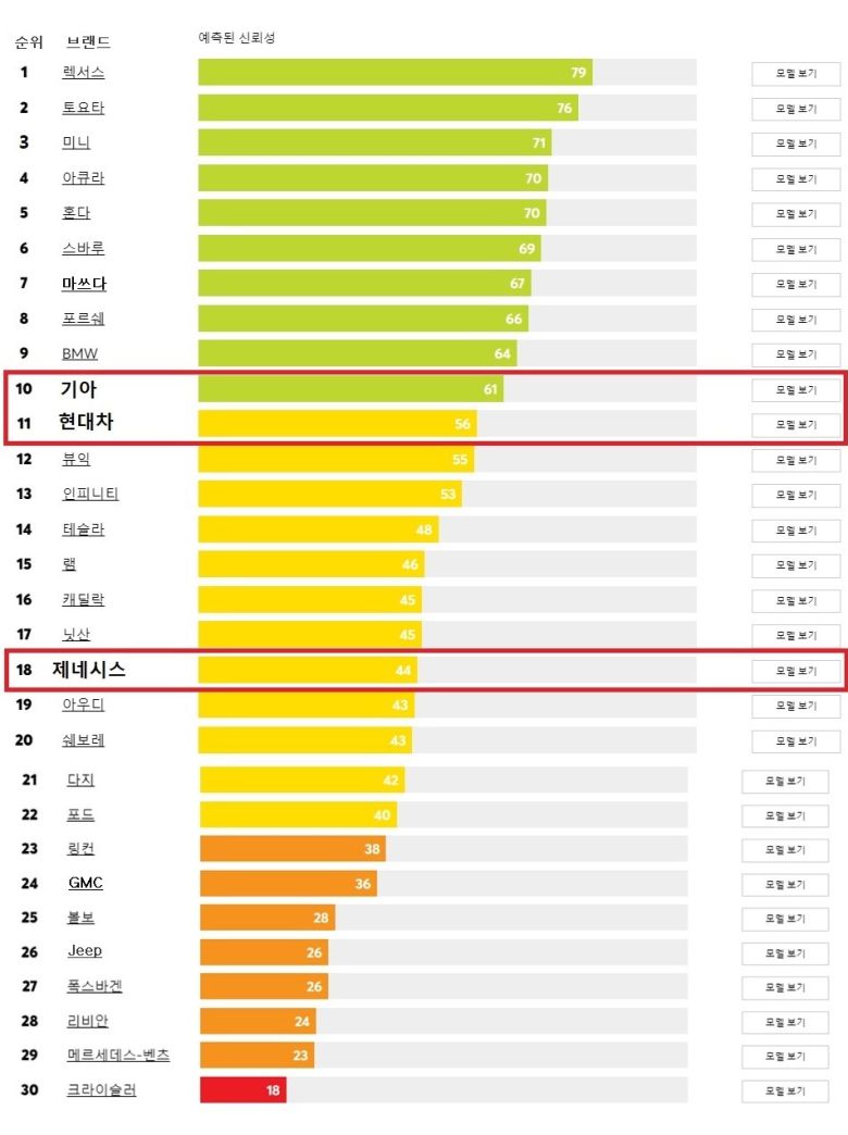 최하위(26∼30위) 5개 브랜드는 지프, 폭스바겐, 리비안, 메르세데스-벤츠, 크라이슬러 등이 이름을 올렸다.
