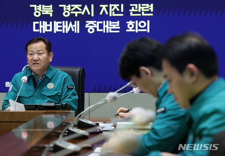 [서울=뉴시스] 배훈식 기자 = 이상민 행정안전부 장관이 지난 11월30일 오전 서울 종로구 정부서울청사 중앙재난안전상황실에서 열린 경북 경주시 지진 관련 대비태세 중앙재난안전대책본부 회의에 참석해 발언하고 있다.
