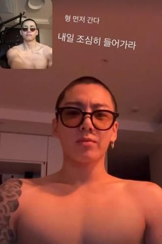 사진 속 뷔는 정국과 똑같이 삭발부터 선글라스, 상의 탈의까지 한 채 비장한 표정으로 카메라를 쳐다보고 있다. 특히 뷔는 '형 먼저 간다. 내일 조심히 들어가라'라는 메시지를 적어 눈길을 끌었다.