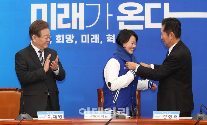 [이데일리 노진환 기자] 정청래(오른쪽) 더불어민주당 최고위원이 11일 오전 서울 여의도 국회 당대표 회의실에서 열린 1호 인재영입식에서 기후위기 전문가인 박지혜(가운데) 변호사에게 목도리를 선물하고 있다. 이재명(왼쪽) 더불어민주당 대표가 박수를 치고 있다.