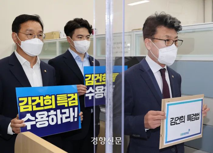 지난해 9월 당시 진성준 더불어민주당 원내수석부대표(오른쪽) 등이 국회 의안과에 ‘김건희 여사 특검법안을 제출하고 있다. 국회사진기자단